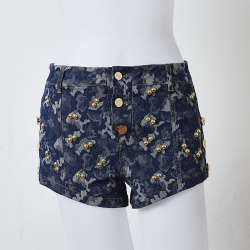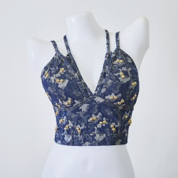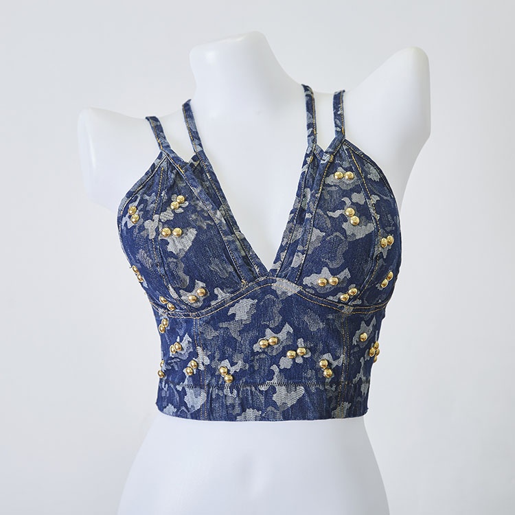 Fashion Lady Denim Halter Cross Back Straps Beading Design Corset Womens Jeans Shorts Denim Vests 2 Pieces Set